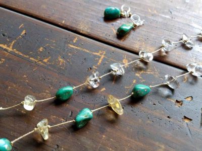 お好みの色の天然石を選び、工具など使わずネックレスを作ります。